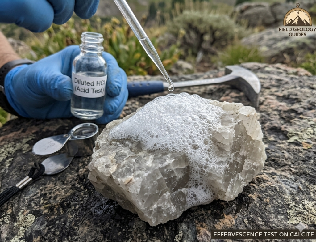 - Acid Test: If you put a drop of weak hydrochloric acid (or even strong vinegar) on calcite, it will fizz and bubble (effervesce). Quartz will not react to acid at all.