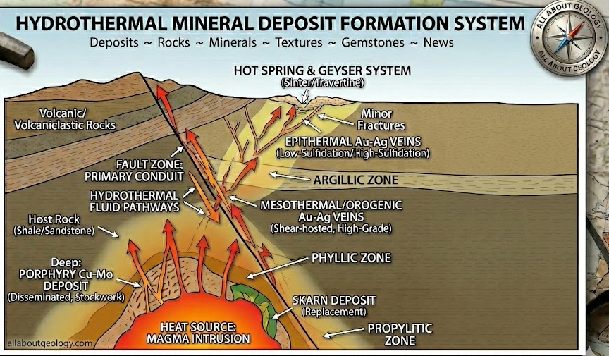 Hot, mineral-rich aqueous fluids circulate through cracks and faults in the Earth’s crust. As these fluids cool, lose pressure, or react with different host rocks, they precipitate dissolved metals, creating massive veins or disseminated zones of ore.