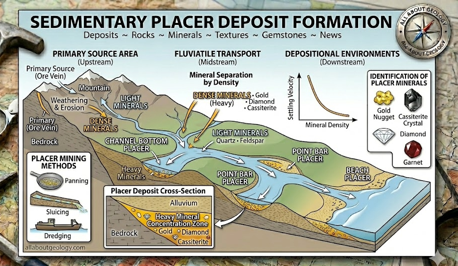Surface processes like weathering, erosion, and water transport can also concentrate heavy minerals. Placer deposits form when dense minerals (like native gold or diamonds) are washed into rivers and accumulate in stream beds where the water current slows down.