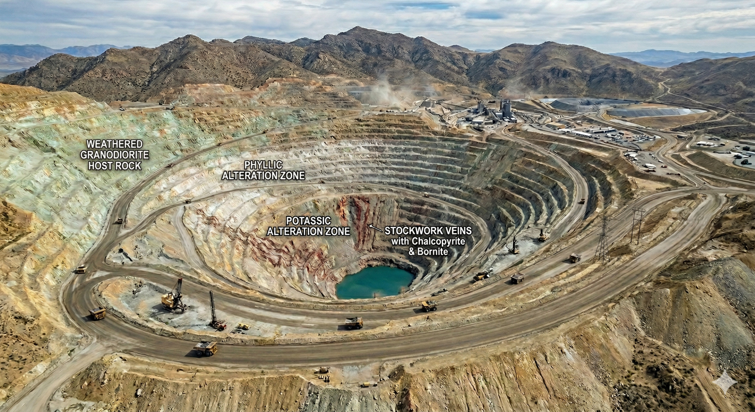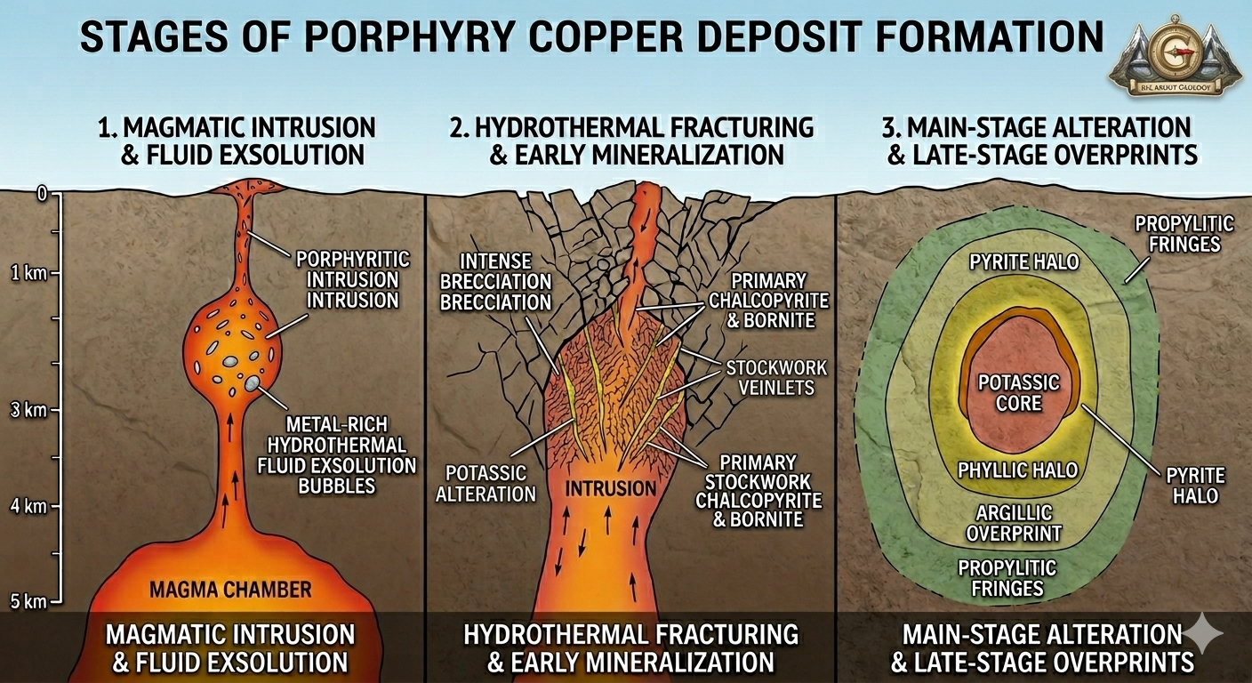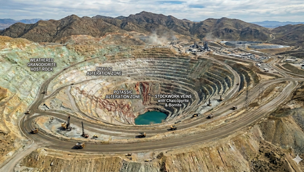 - Potassic Zone (The Core): Characterized by secondary K-feldspar and biotite. This is the hottest zone and typically hosts the highest grades of copper and gold.