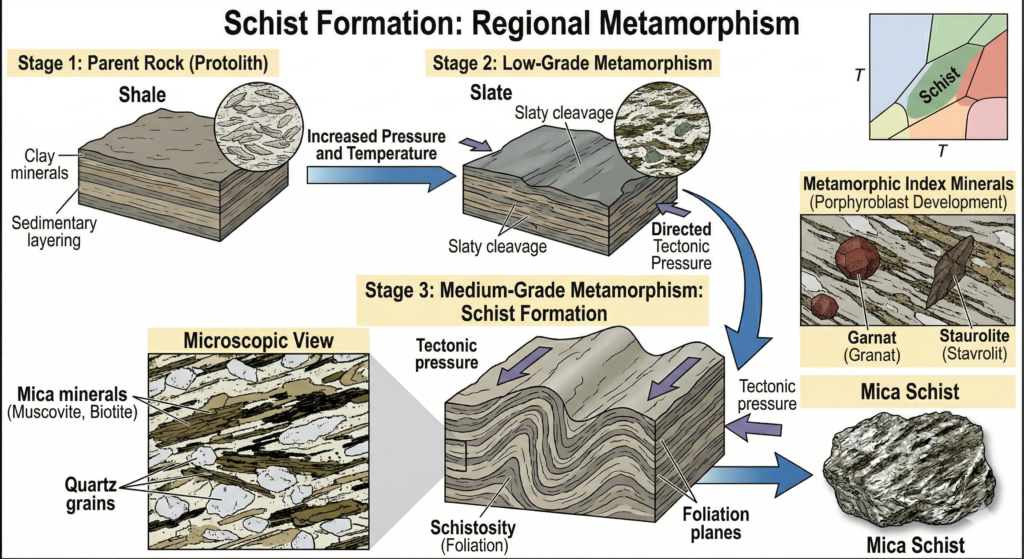 Schist forms primarily through the regional metamorphism of clay-rich sedimentary rocks (like shale or mudstone) or sometimes fine-grained igneous rocks (like basalt).