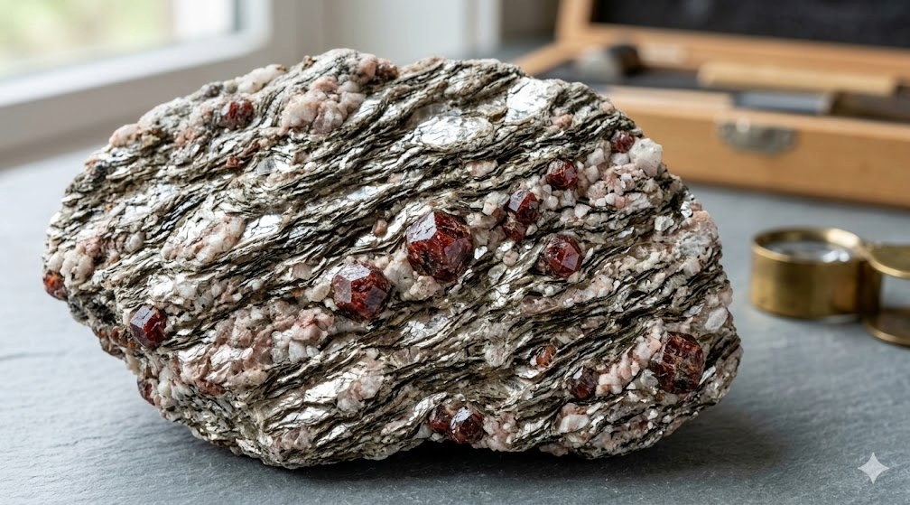 - Porphyroblasts (Index Minerals): Schist is famous for hosting large, distinct, beautiful crystals that grow within the mica matrix. Depending on the temperature and pressure of formation, you will often find Garnet, Staurolite, or Kyanite crystals embedded in the rock (creating variations like the famous “Garnet Mica Schist”).