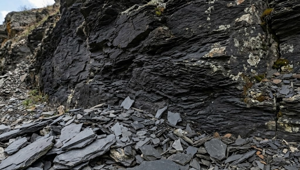 Beyond its academic importance, shale is a massive economic driver. Black shales are the primary source rocks for the world’s petroleum and natural gas reserves. As the organic matter in the shale is buried and heated, it transforms into hydrocarbons. In modern energy sectors, horizontal drilling and hydraulic fracturing (fracking) are used to extract trapped natural gas directly from impermeable shale formations. Additionally, shale is extensively quarried for the production of cement, bricks, and ceramics.